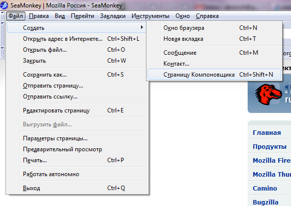 Шаг 2. Запустите SeaMonkey и создайте новый документ (Меню Файл -> Создать -> Страницу Компоновщика).