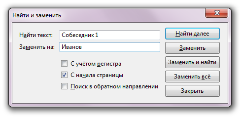 Шаг 4 (опционально). В меню “Правка” выберите пункт “Найти и заменить” и произведите автоподстановку реальных имен в документ.